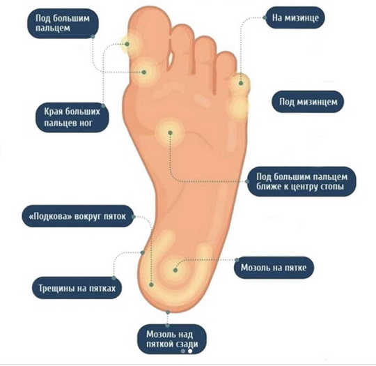 - Натоптыши — обширные участки утолщённой кожи, чаще без выраженного стержня, но доставляющие дискомфорт при ходьбе.